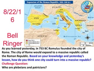 - The Roman Republic began in 509 BC after the overthrow of the last Roman king. It established a system where elected representatives led the people rather than kings.