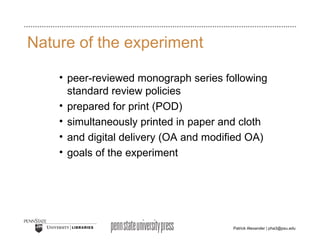 The document outlines an experiment by Pennsylvania State University's Office of Digital Scholarly Publishing focusing on online open access and traditional print monograph publishing. It details the goals of maintaining peer review standards, providing an outlet for first-time authors, and ensuring broader dissemination and classroom adoption, while also addressing the financial and operational challenges faced by university presses. Despite partial success in achieving its goals, the project highlights the complexities and costs associated with sustaining both print and digital publishing in academia.