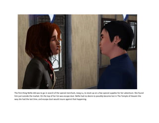 Nellie explores the Temple of Heaven, finding hidden rooms and treasures. She encounters statues that open doors and discovers relics and coins. Too tired to continue, she rests for the night. Upon waking, she explores more areas, finding a royal bedroom and opening more doors in the maze-like structure. She eventually finds the relic sought by Lu Zhi. When reporting back, Lu Zhi says part of the treasure's writings are still missing and held by Liang Yat Sen's family. Nellie convinces Liang to hand over the missing piece after chatting with him for a few hours.