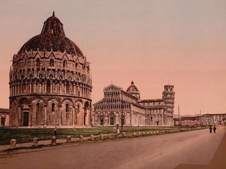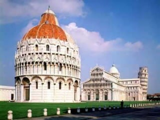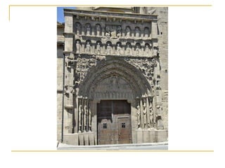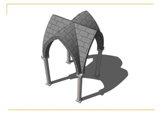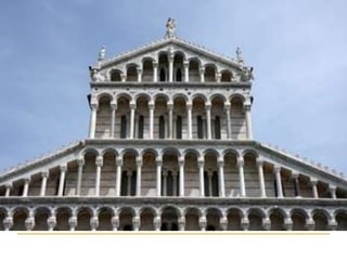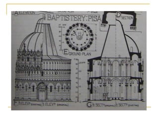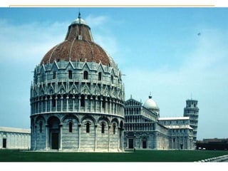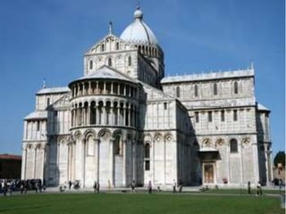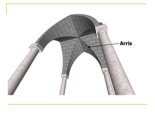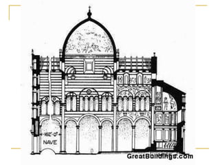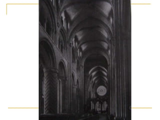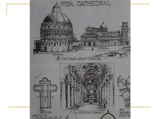 Romanesque architecture developed between 1000-1150 AD and was inspired by Roman architecture. It used round arches, stone construction, and a basilica-style plan. Influences also came from other cultures. Romanesque architecture was characterized by thick walls, small windows, barrel or groin vaults, and decorative blind arches. It included churches with a nave, aisles, transept, and apse, as well as monasteries and castles. Stone, brick, and limestone were common building materials, with columns constructed of salvaged pieces or built up from stone drums.