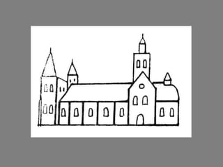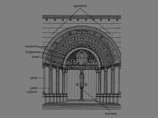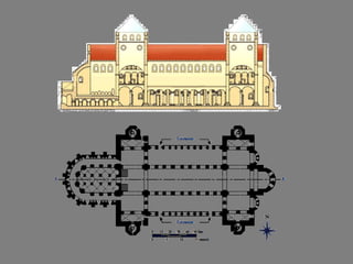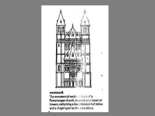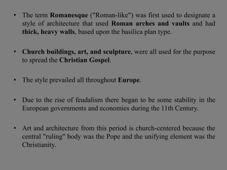 Romanesque architecture developed between 800-1100 AD and was characterized by thick walls, small windows, round arches, and barrel or groin vaulting. Churches during this period served to spread Christianity and featured a Latin cross plan with a nave, aisles, transept, and apse. Sculptural decoration appeared on church portals and capitals. The Pisa Cathedral complex, built between 1063-1118, exemplifies Romanesque architecture with its large nave and aisles, projecting transept and crossing dome, and famous leaning bell tower.