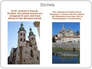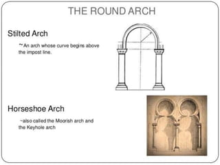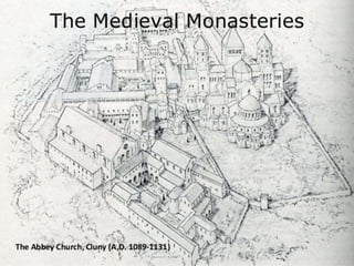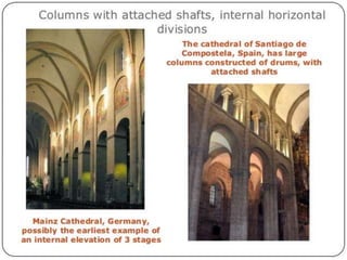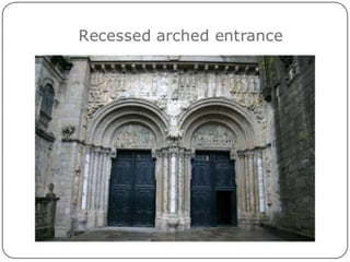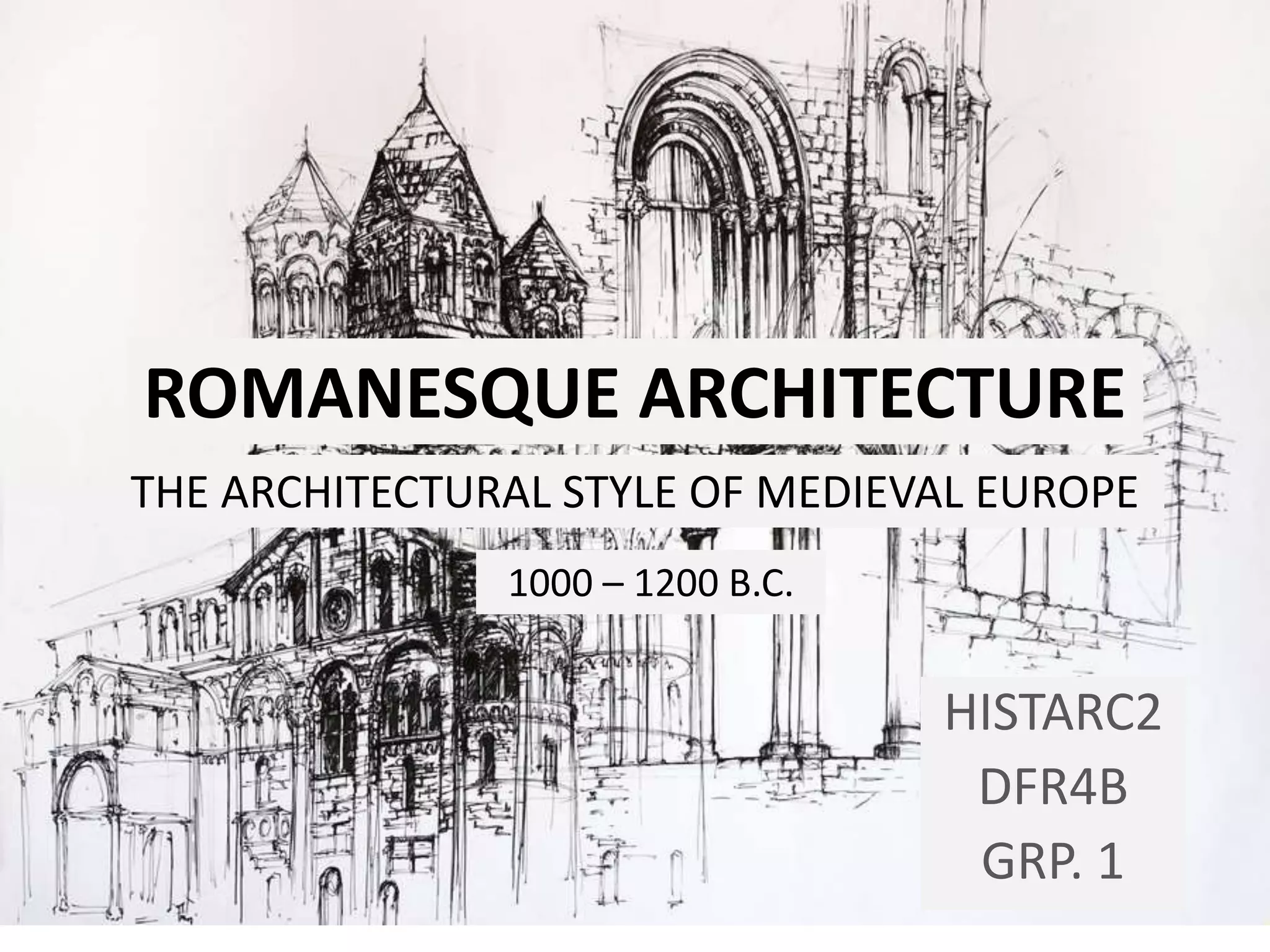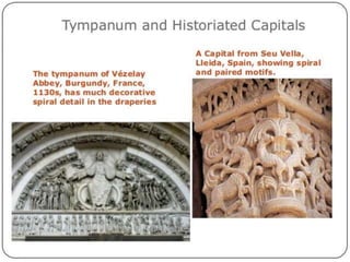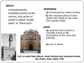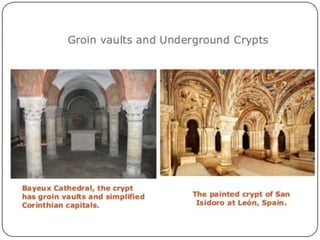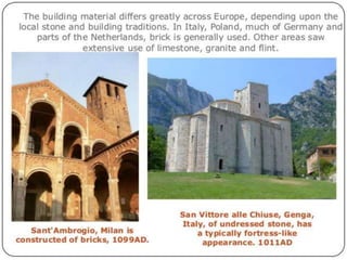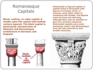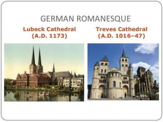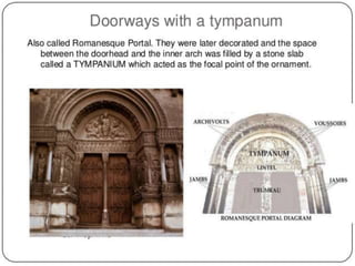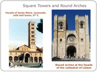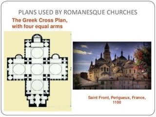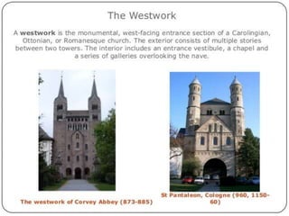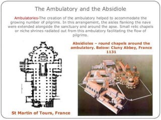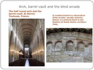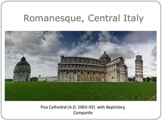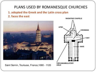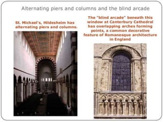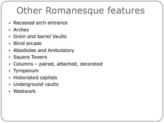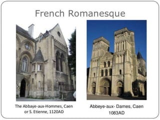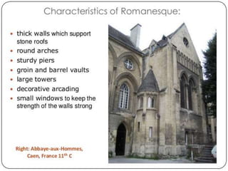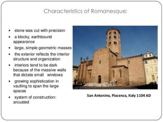 The document discusses Romanesque architecture, a medieval European style prevalent from 1000 to 1200 A.D., characterized by the church's role in society and the use of local materials. It highlights the historical context of the time, including the Crusades and the increase in church construction, and defines the architectural features associated with Romanesque buildings. The style is named for its resemblance to Roman architecture and reflects the cultural and religious priorities of the period.