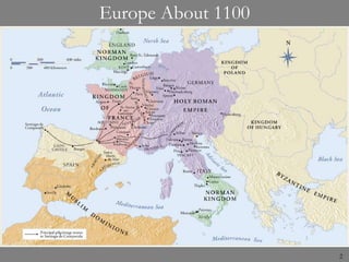 This document provides an overview of Romanesque art and architecture in Europe from about 1100. It examines the spread and influence of Romanesque style through pilgrimages and crusades. Key architectural elements are identified, including the barrel vault, ambulatory, and radiating chapels. Regional variations are discussed, such as the distinct Italian style featuring stone tracery and pinnacles. Sculpture and painting from the era are also summarized, including the Bayeux Tapestry and illuminated manuscripts. Important sculptors like Gislebertus are named.