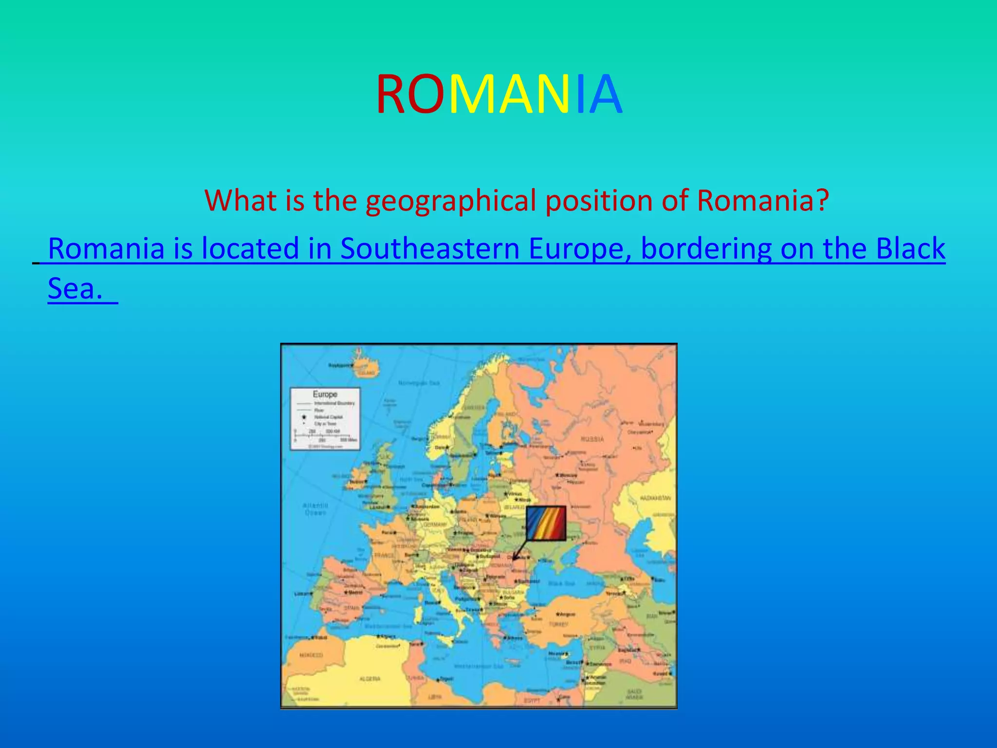 Romania is located in Southeastern Europe bordering the Black Sea. Its capital is Bucarest, and three other major cities are Brasov, Cluj, and Ias. Some notable Romanian personalities include poet Mihai Eminescu, sculptor Constantin Brancusi, and painters Nicolae Tonitza and Nicolae Grigorescu. Traditional Romanian food includes salata de boeuf, salata de vinete, zacusca, ciorba and cozonac. Romanian folk costumes feature colorful fabrics and traditional clothing differs between women, men, and children. The legend of Count Dracula is one famous legend about Romania.