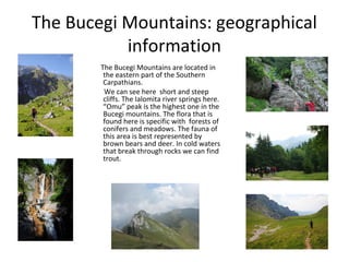 The document summarizes tourist routes and attractions in Romania's Bucegi Mountains region. It describes the geography of the Bucegi Mountains, including its highest peak, Omu Peak. It then outlines a tourist route to reach Omu Peak, starting from the villages of Busten and Padina, passing landmarks like Diham and Malaiesti cottages along the multi-hour hike. Finally, it mentions the historic Peles Castle in Sinaia as a top tourist attraction to visit, describing it as a Neo-Renaissance castle that served as the summer residence for Romania's former kings.