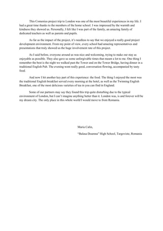 This document summarizes Maria Calin's experience on a Comenius project trip to London from her high school in Romania. She found the trip to be one of the most beautiful experiences in her life thanks to the warmth and kindness shown by members of the host school, making her feel like part of their family. During activities for the project, representatives from each school gave amazing presentations that showed the huge involvement in the project. Maria enjoyed exploring London at night on the Tower Bridge and having dinner at a traditional English pub. She particularly enjoyed the traditional English breakfast served each morning and Twinning English Breakfast tea. While some partners found London's environment disturbing, Maria could not imagine anything better and sees London as her dream city that she