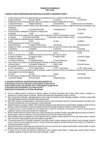 Documentul este un test din 2010 privind romanitatea românilor, care conține întrebări despre curente culturale, istorici, și lucrări relevante pentru studiul istoriei și originii românilor. Testul este structurat în întrebări cu variante multiple și analize, solicitând identificarea corectă a conceptelor și tezelor istorice. De asemenea, documentul discută despre polemici istorice și personalități relevante pentru studiile românității.