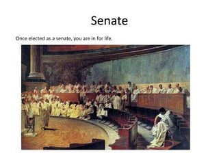 The Roman Republic had a Senate that served for life and two Consuls who were elected military commanders and public officials. In emergencies, a Dictator could temporarily rule for six months. Tribunes protected and advocated for the plebeians and could veto senate laws. Rome had a republic with executive, legislative, and judicial branches. There was conflict between the Patrician higher class and lower class Plebeians over civil rights until the Assembly of the Plebs expanded democracy for plebeians. Other offices included the Censor to collect taxes and organize military duties, and annual Praetors to lead the judiciary and armies. Laws were written on the Twelve Tables tablets.