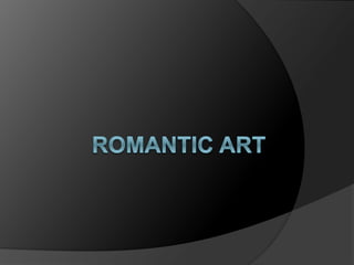 This document provides information about Romanticism as an artistic movement that originated in the late 18th century. It discusses key Romantic artists like Caspar David Friedrich, Francisco Goya, and John Constable who often used melancholy themes and dramatic subjects. The characteristics of Romanticism included irregularity, irrationality, and an emphasis on individuality. Some techniques used were deliberate brushstrokes and exaggeration. The document also briefly mentions the Hudson River School and Pre-Raphaelite Brotherhood as examples of Romantic styles and provides examples of Romantic paintings, sculptures, and architecture.