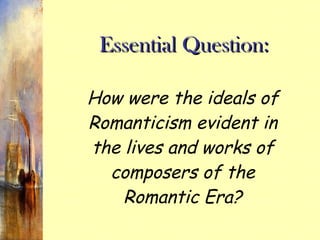 The document discusses several ways Romantic ideals were evident in the lives and works of Romantic composers. It explores exoticism through composers like David, Verdi and Bizet who were fascinated by foreign lands and incorporated influences from Egypt, the Middle East, Brazil and Spain into their compositions. Nationalism is examined through composers like Chopin, Tchaikovsky and Verdi who expressed their national pride and supported independence movements through their music. Individual power and revolutionary fervor are seen in Beethoven and Wagner who were inspired by political uprisings and expressed strong personal beliefs through ambitious works like Beethoven's Eroica Symphony and Wagner's anti-Semitic writings.