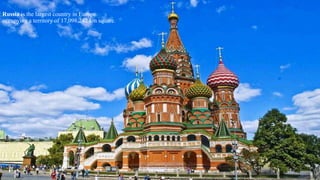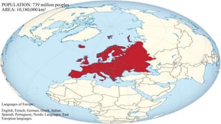 Europe has a population of 739 million people across 10.18 million square kilometers. It is home to many languages including English, French, German, Greek, Italian, Spanish, Portuguese, and others. Russia is the largest European country by area while Vatican City is the smallest with only around 800 residents. Some of Europe's most notable geographic features include the longest lake Balaton in Hungary and the Danube River which flows through 12 countries. Christianity is the dominant religion and soccer is very popular across Europe's 47 countries. Some of Europe's most famous landmarks are the Eiffel Tower in Paris, St. Peter's Basilica in Rome, and the expensive Champs-Élysées street in Paris known for boutiques and