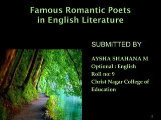 The document summarizes key British Romantic poets such as William Wordsworth, Mary Shelley, John Keats, William Blake, George Byron, Samuel Taylor Coleridge, Mathew Arnold, and Percy Shelley. It provides biographical details and lists major works for each poet. The Romantic poets reacted against the rationalism of the Enlightenment and cultivated individualism, reverence for nature, idealism, and passion in their works. They believed nature provided joy and answers to mankind's unanswered questions.