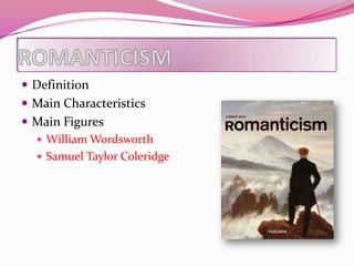 Romanticism arose in the late 18th century as a response to Enlightenment ideals. It valued human subjectivity, emotion, nature, imagination and the sublime. Two of its main figures were William Wordsworth and Samuel Taylor Coleridge. Wordsworth found inspiration in nature and the imagination. His Lyrical Ballads used everyday language. Coleridge distinguished imagination from fancy and viewed imagination as a power that completes understanding. Both poets emphasized the difference between poetic and prose language.