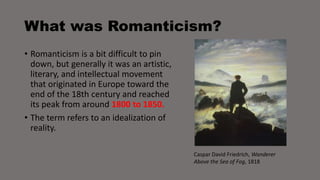 This document provides an overview of Romanticism in painting. It discusses how Romanticism valued depictions of nature as sublime and awe-inspiring. Key characteristics included a focus on individual genius and emotion, as well as opposition to classical norms and industrialization. The document explores works by Romantic painters like Caspar David Friedrich, J.M.W. Turner, Theodore Gericault, and Eugene Delacroix that capture feelings of melancholy, mystery, and the power of nature through their dramatic landscapes and scenes. It also notes Romanticism's influence on later artistic periods and questions whether Romantic ideals still exist today.