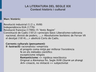 SEGLE XIX Context històric i cultural Marc històric: Revolució industrial (1/2 s. XVIII)