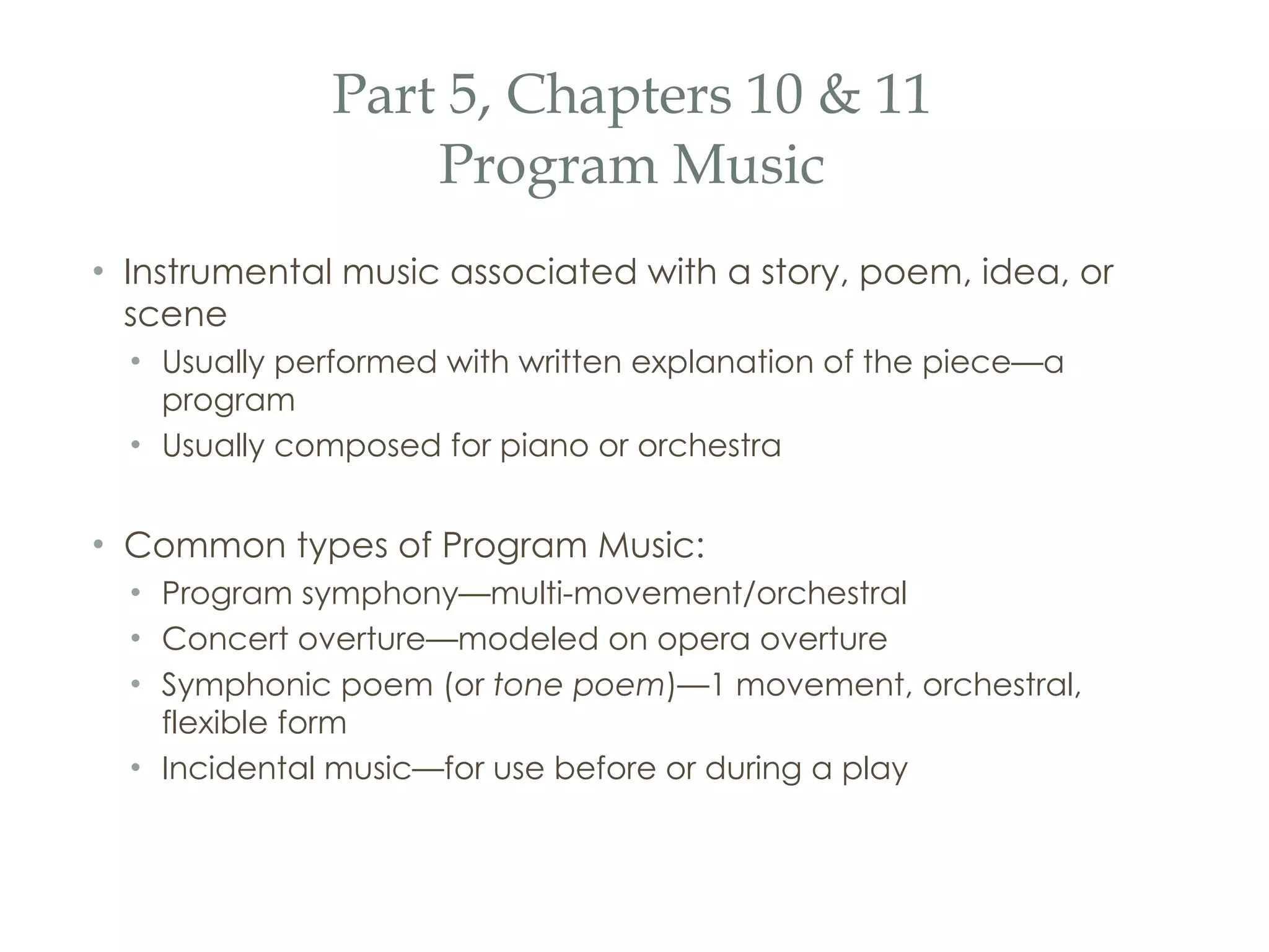 The document discusses program music, which is instrumental music associated with an extra-musical story, poem, or scene. It introduces Hector Berlioz as a pioneer of program music and discusses his Symphonie fantastique. It then discusses the rise of musical nationalism in the Romantic period, where composers incorporated elements of folk music and stories from their native countries and cultures into their music. It provides examples from Bedrich Smetana, Antonin Dvorak, Peter Ilyich Tchaikovsky, and Johannes Brahms.