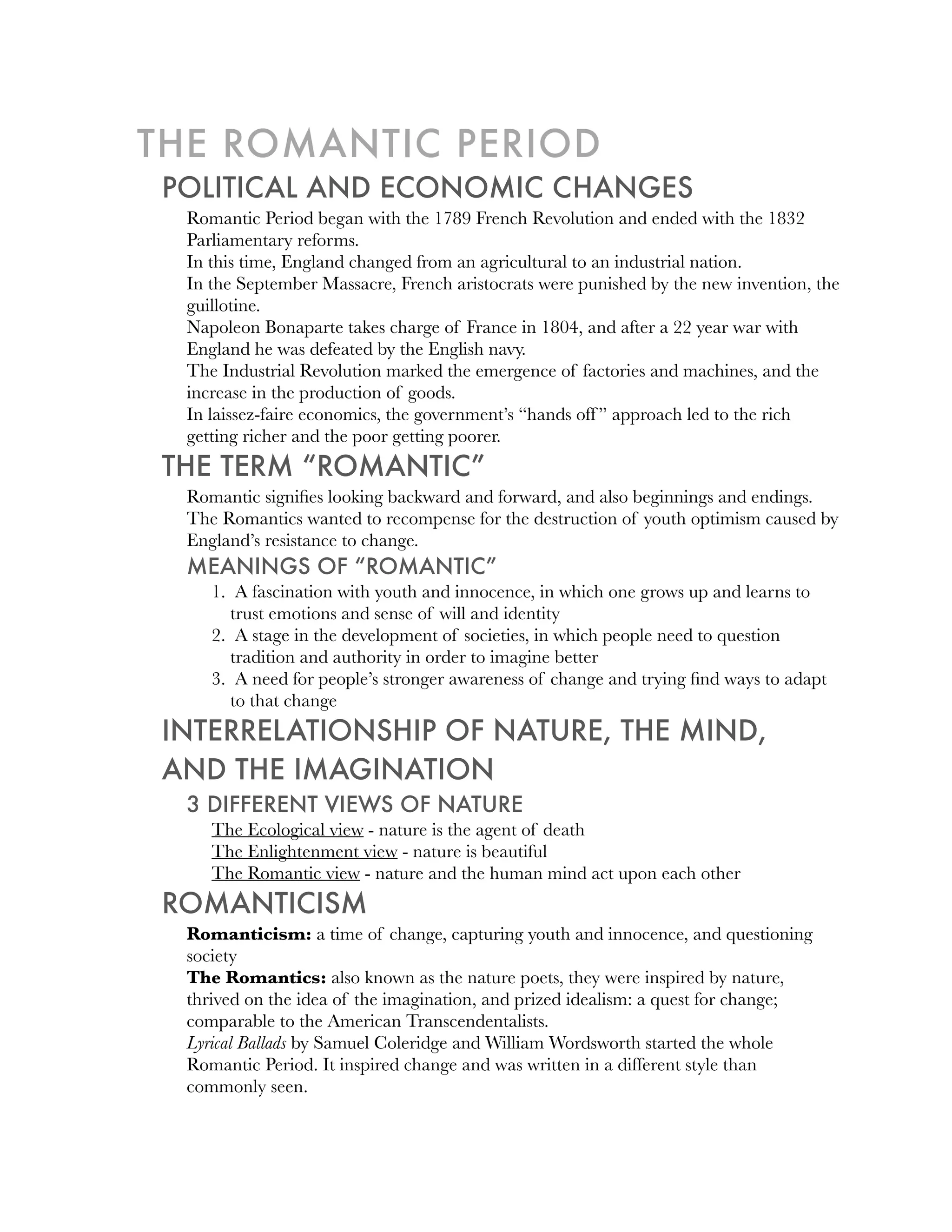 The Romantic Period in England spanned from 1789 to 1832, a time of political, economic, and industrial changes. Romanticism valued nature, imagination, emotion, individualism and idealism. Major Romantic writers included William Wordsworth, Samuel Taylor Coleridge, Percy Bysshe Shelley, and John Keats. Their works explored themes of nature, childhood, and humanity's connection to the natural world through vivid descriptions and complex emotions.