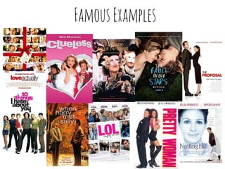 The genre of romantic comedies began in the early 1930s with films like Trouble in Paradise, building on conventions from Shakespearean comedies featuring romance plots. Typical rom-coms follow a "meet cute" structure where the future couple meets awkwardly or amusingly at the start and their romance develops over the film. In the 1990s, rom-coms took a new direction with films like When Harry Met Sally featuring more sexually charged narratives. Modern studios now experiment with sub-genres and complex topics while maintaining the typical happy ending.