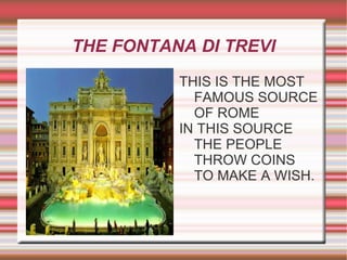 The document describes 4 famous landmarks in Rome. The Fontana di Trevi is Rome's most famous fountain, where people throw coins to make wishes. St. Peter's Cathedral is the most important cathedral in Christianity where the Pope holds mass. The Roman Arch is a high but elegant monument that represents the power of the Roman Empire. The Roman Colosseum was where warriors fought for their lives against each other or wild beasts for entertainment.