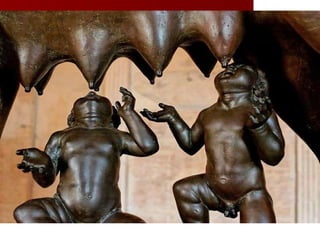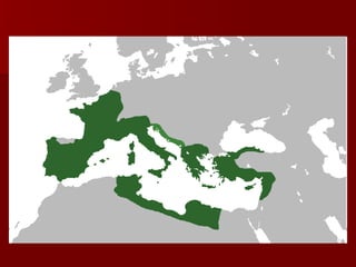 The document summarizes the founding and history of Rome. It describes how Rome was founded by Romulus and Remus and eventually grew to become a republic ruled by senators. Rome then expanded through war and conquered the Etruscans, Greeks, Carthaginians, and many other neighboring cultures. The republic transitioned into an empire under Caesar and later emperors like Augustus, who initiated the Pax Romana period of peace and prosperity that lasted over 200 years.
