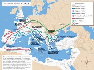 2) The migration of Germanic tribes into Roman lands due to pressures from the Huns, seeking better land and climate. This led to conflicts as Rome took advantage of the tribes.