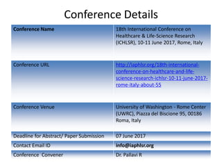 This document provides information about the 18th International Conference on Healthcare & Life-Science Research that will take place from June 10-11, 2017 in Rome, Italy. Key details include the conference venue at the University of Washington Rome Center, a deadline of June 7 for abstract/paper submissions, and various themes related to healthcare and life sciences research. Information is also provided about registration fees, publication opportunities, and the conference organizing association, IAPHLSR.