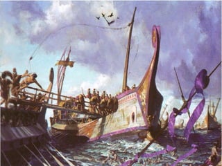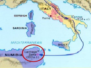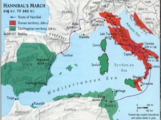The document summarizes the rise of the Roman Empire from 500 BC to 500 AD. It describes how Rome conquered the Mediterranean region through military victories over Carthage in the Punic Wars, establishing its dominance. It also discusses aspects of Roman society such as government, law, daily life, and the impact of geography in allowing the empire to thrive.