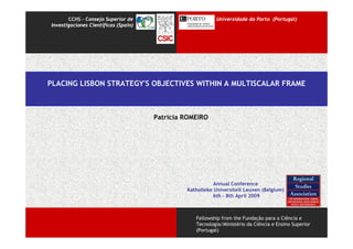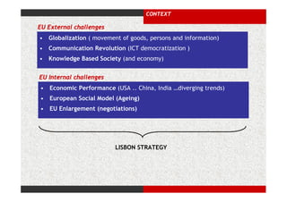 The document discusses how the Lisbon Strategy was coordinated across different geographical scales from the EU to local levels. It analyzes how the strategy's objectives were implemented from the EU to Bilbao, Spain, with a focus on information and communication technologies. The document concludes that the strategy lacked coordination across scales and that regions play a vital role in engaging citizens. It highlights Bilbao's digital agenda as a good practice of multiscale implementation.