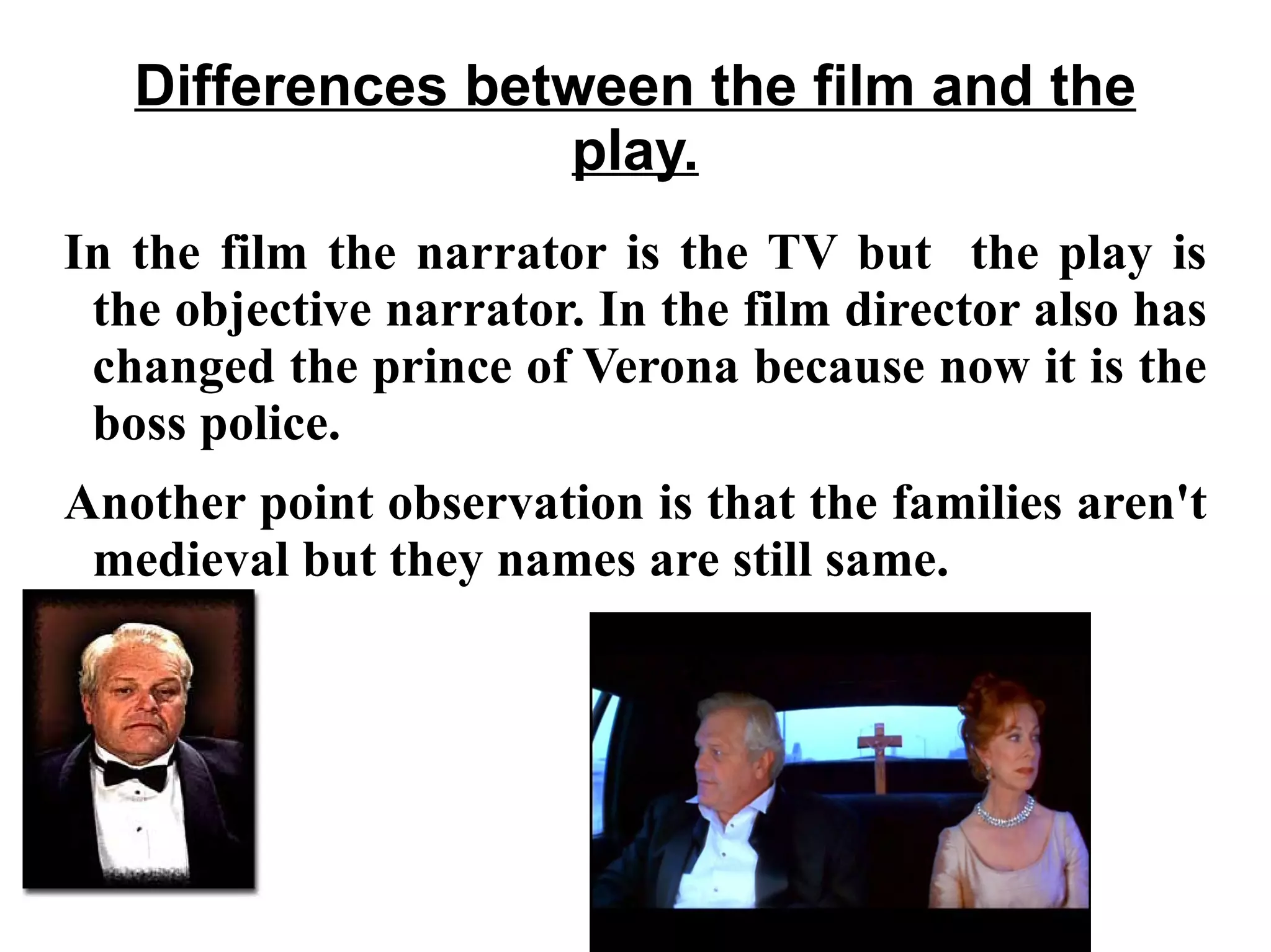 The film adaptation of Romeo and Juliet differs from the play in several key ways: the narrator is a TV instead of an objective narrator, the prince of Verona is now the police boss, and while the family names are the same they are no longer medieval but modern. Additionally, swords are replaced with guns, the family feud starts at a gas station instead of the streets, Mantua represents a desert instead of a city, Juliet kills herself with a gun instead of a dagger, and the police explain the deaths instead of Friar Laurence.