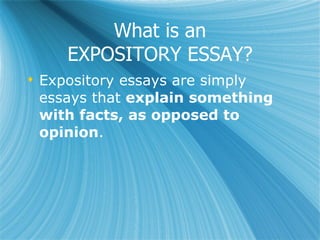 The document provides instructions for writing an expository essay about William Shakespeare's Romeo and Juliet. It explains that an expository essay uses facts rather than opinions to explain a topic. The essay assignment asks students to identify which character(s) were most to blame for Romeo and Juliet's deaths, and support their thesis with evidence quoted from the play. It defines a thesis statement as a sentence that tells what the essay will prove and previews its main points, functioning like a topic sentence for the entire essay.