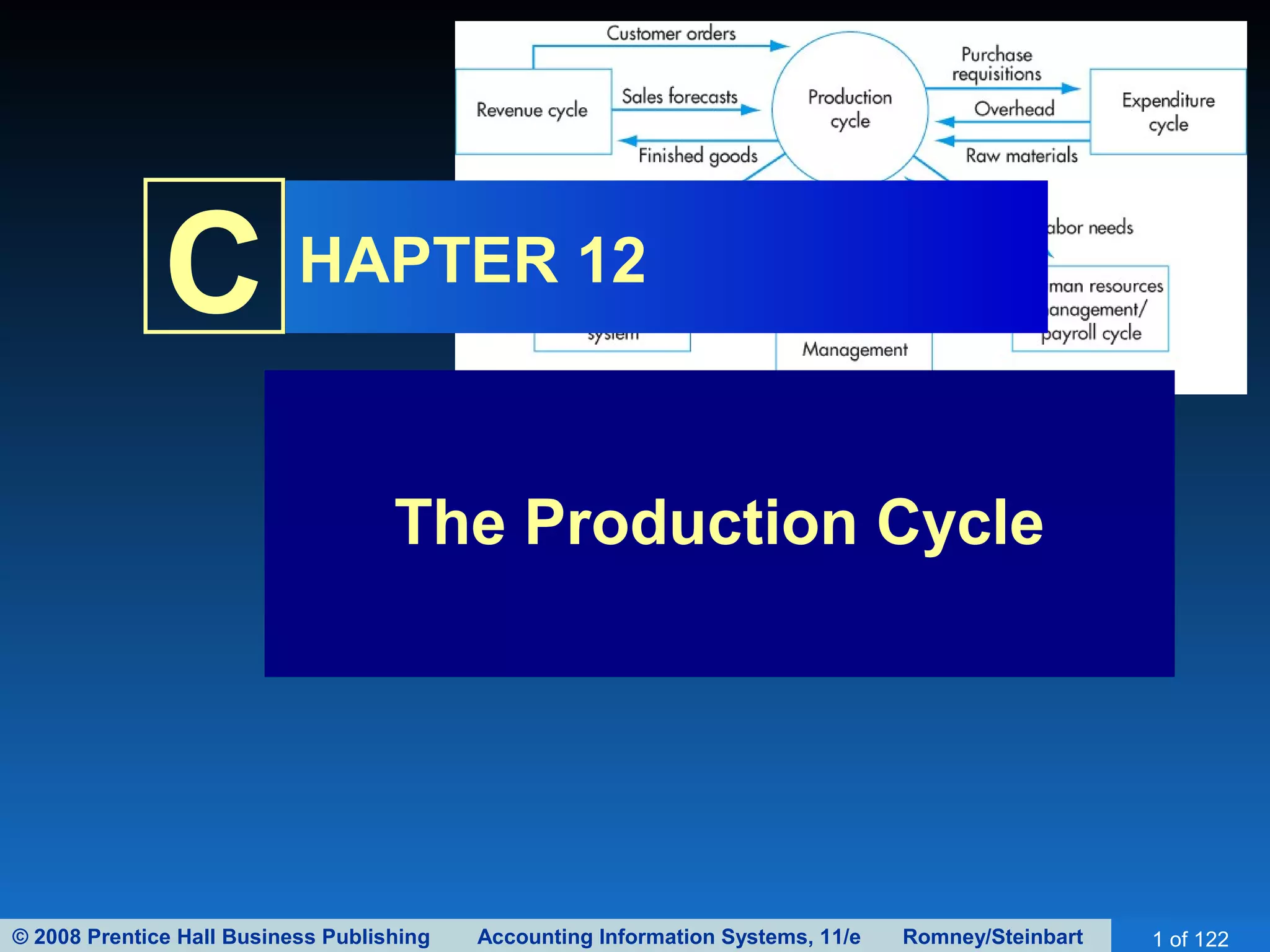 The document discusses the production cycle of a manufacturing business. It describes the four main activities in the production cycle as product design, planning and scheduling, production operations, and cost accounting. Accountants are primarily involved in cost accounting but must understand the entire production cycle. The document outlines the objectives and key documents/forms used for product design and planning/scheduling.