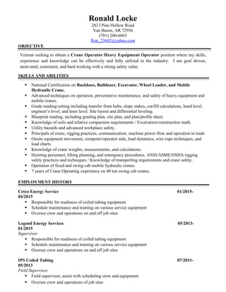 Ronald Locke is a veteran seeking a position as a Crane Operator or Heavy Equipment Operator. He has over 7 years of experience operating 40-ton swing cab cranes. He holds national certifications for operating backhoes, bulldozers, excavators, wheel loaders, and mobile hydraulic cranes. Locke has worked in various supervisory and equipment operator roles for companies such as Cetco Energy Service, Legend Energy Services, IPS Coiled Tubing, and Schlumberger Coiled Tubing Division since 2001.