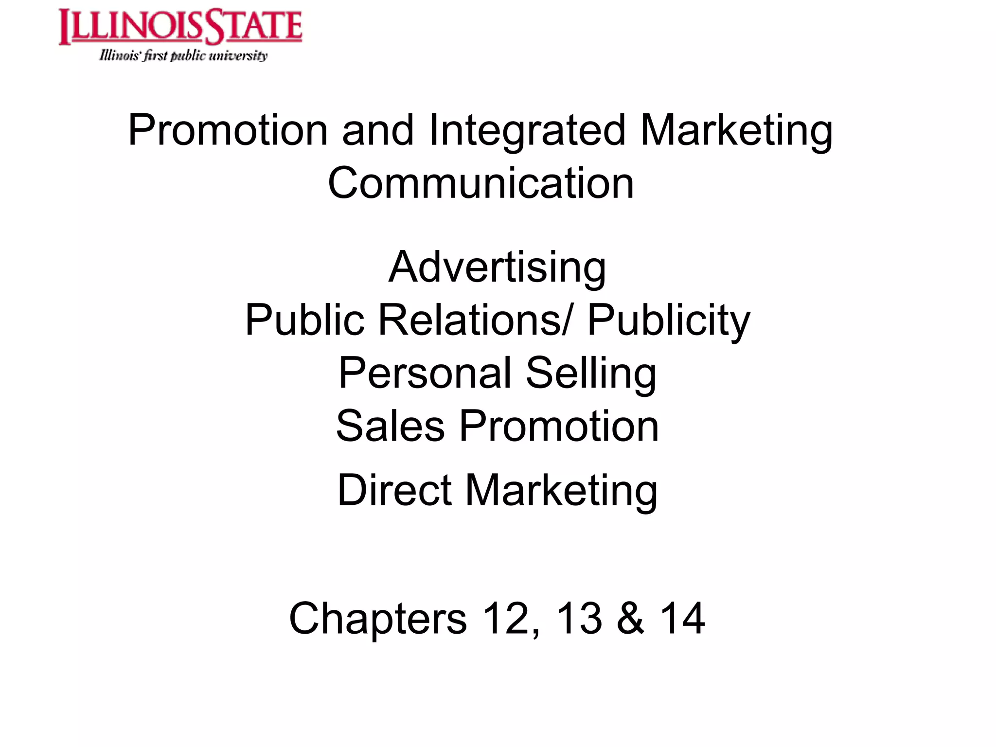 This document provides an overview of marketing communications, including advertising, public relations, personal selling, sales promotion, and direct marketing. It discusses the objectives of marketing communications programs as well as strategies for developing integrated marketing communication plans and selecting an optimal promotional mix. Key aspects covered include developing advertising campaigns, evaluating advertising effectiveness, conducting public relations, and managing personal selling and sales. The document presents frameworks for conceptualizing these various promotional techniques and their application in consumer and business markets.