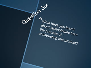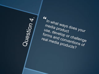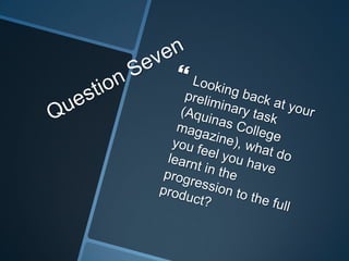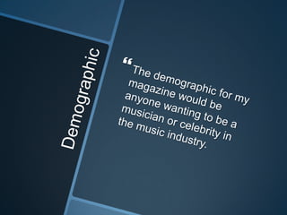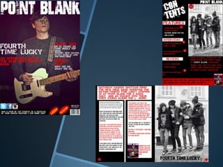 Ronan Beirne created a magazine aimed at teens and young adults interested in punk and heavy rock music. The magazine would feature band interviews, reviews of gigs and fashion related to the target audience's interests. Beirne refined their design skills using Photoshop and Publisher to create a magazine mock-up with a professional layout, including a cover featuring a rock musician, contents page and double page spread. Through repeated drafting, they improved the color scheme, images and structure to better address the niche audience.
