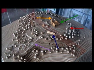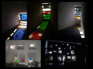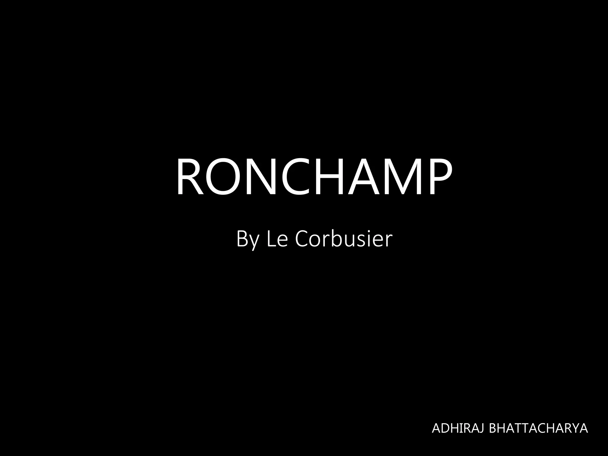 The Ronchamp Chapel designed by Le Corbusier in 1955 is located in Ronchamp, France and is dedicated to the Virgin Mary. It was rebuilt after being damaged by fire and bombing. The simple concrete structure has an oblong nave with side entrances and axial altar. It features a sculptured Virgin Mary, southern windows, and a rough concrete roof supported by embedded columns. The design was inspired by praying hands, a ship, and other forms and uses light and decorations symbolizing opposites.