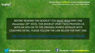 The document outlines a progression of football rondos created by J. Davies, aimed at enhancing player movement and ball circulation in training sessions. It emphasizes the importance of the weak-side full back movements and offers detailed instructions on the positional play and objectives during the rondo exercises. Additionally, it highlights the educational value of rondos in player development, influenced by techniques observed at top clubs like Barcelona.