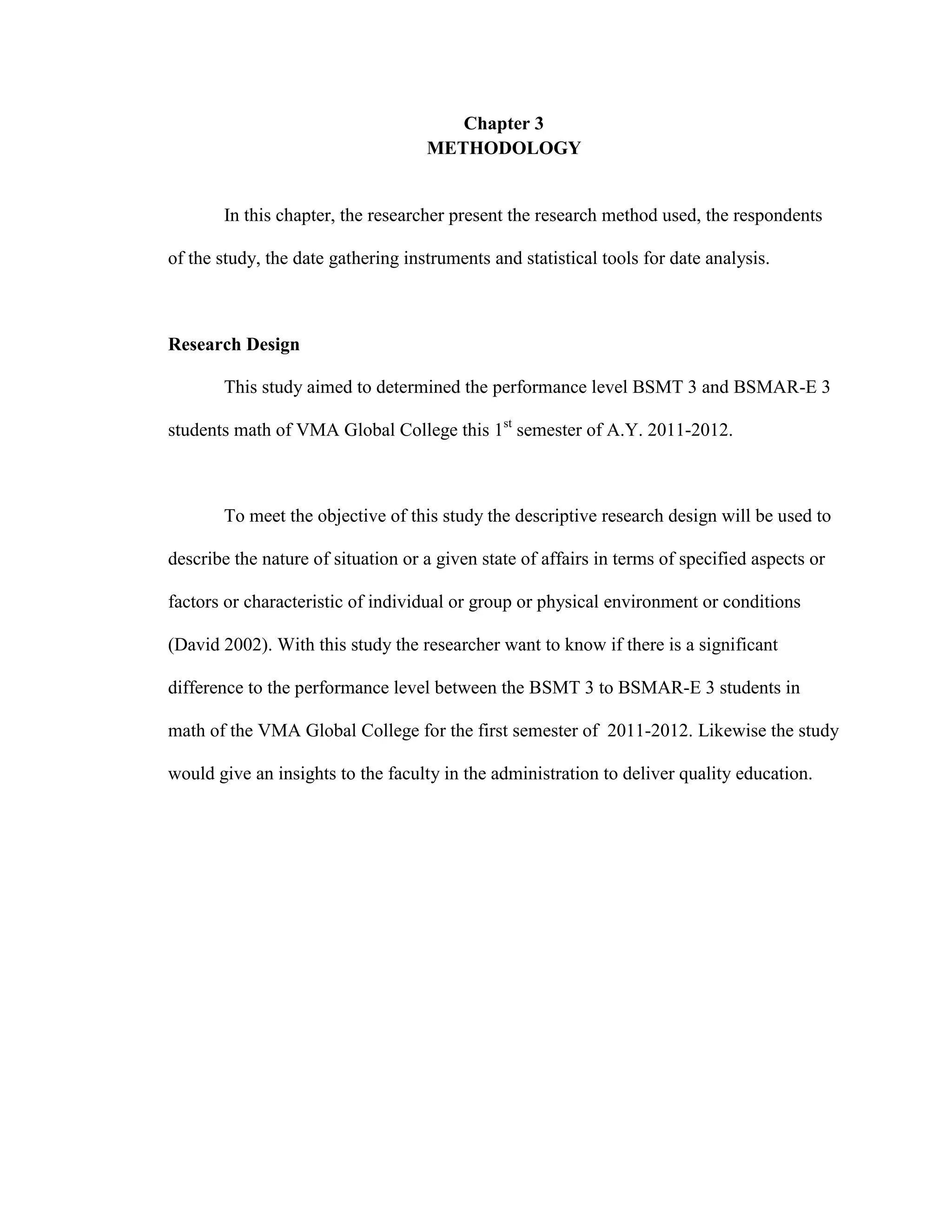 This chapter outlines the methodology used in the study. A descriptive research design was used to determine the math performance levels of third year BSMT and BSMAR-E students at VMA Global College in the first semester of 2011-2012. The respondents were 400 third year students who were randomly selected using proportional sampling. Data was collected through a self-administered questionnaire that was validated by 3 jurors and found to be "very good".