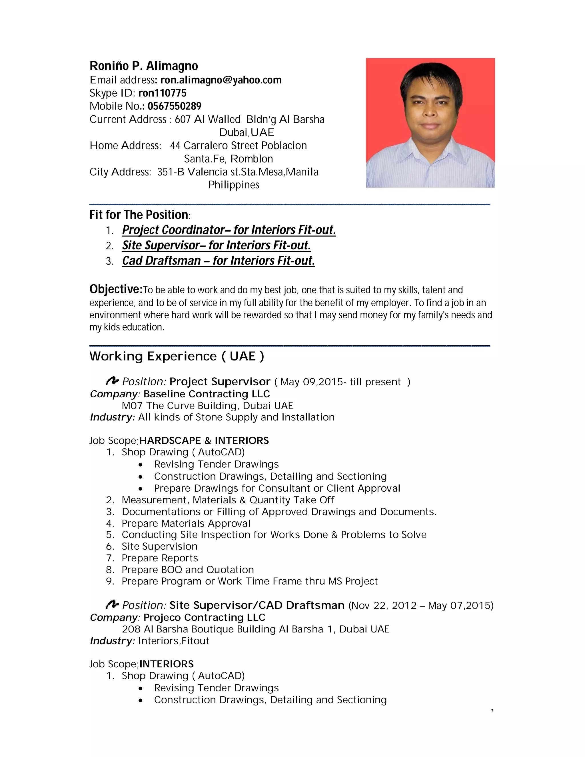 Roniño P. Alimagno is seeking a position as a Project Coordinator, Site Supervisor, or CAD Draftsman for interiors fit-out projects. He has over 15 years of experience in these roles in both the Philippines and UAE. His experience includes shop drawing, site supervision, project management, and coordinating subcontractors. He is proficient in AutoCAD, 3Ds Max, and other design software.