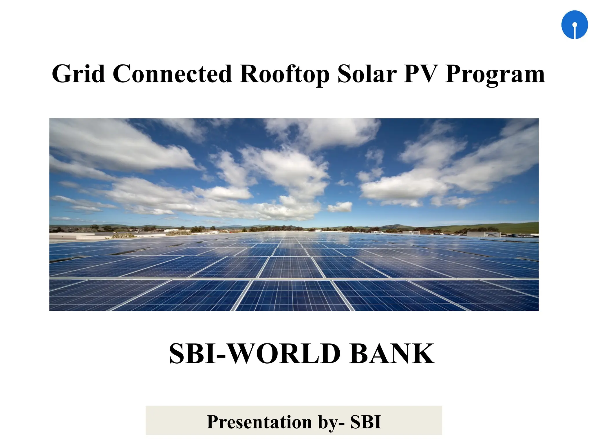 The document outlines the SBI-World Bank program for financing grid-connected rooftop solar PV projects in India, aimed at achieving a target of 100 GW of solar power capacity. SBI has committed Rs 75,000 crore to finance renewable energy projects and has established various business models and financing modes to facilitate project execution. Eligible projects include commercial, industrial, and institutional rooftops, with specific criteria for both program and project modes of financing.