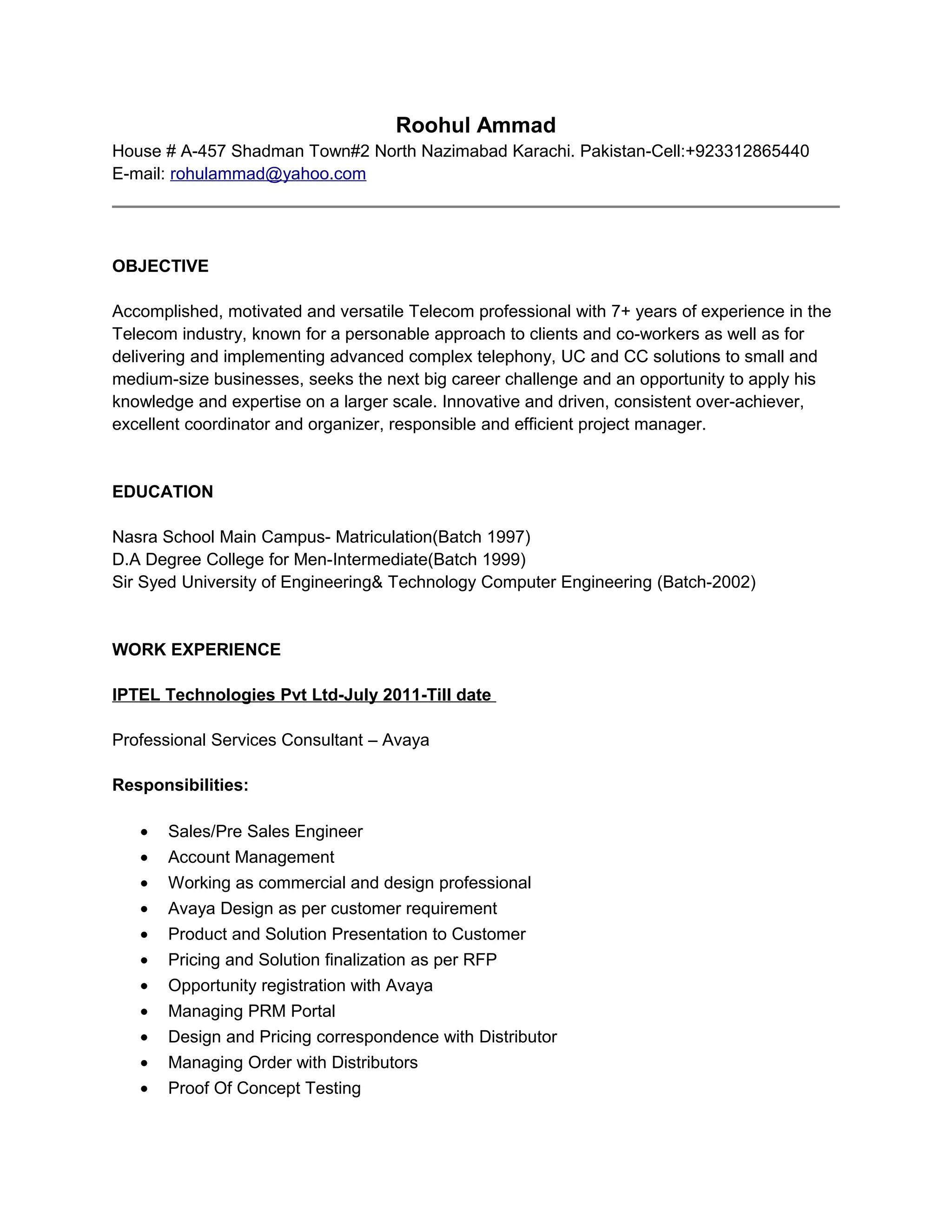 This document is a resume for Roohul Ammad, a telecom professional with over 7 years of experience in the telecom industry. He is seeking a new career challenge where he can apply his expertise on a larger scale. His resume outlines his education, work experience implementing Avaya solutions at IPTEL Technologies, and technical expertise in various Avaya and Cisco technologies.