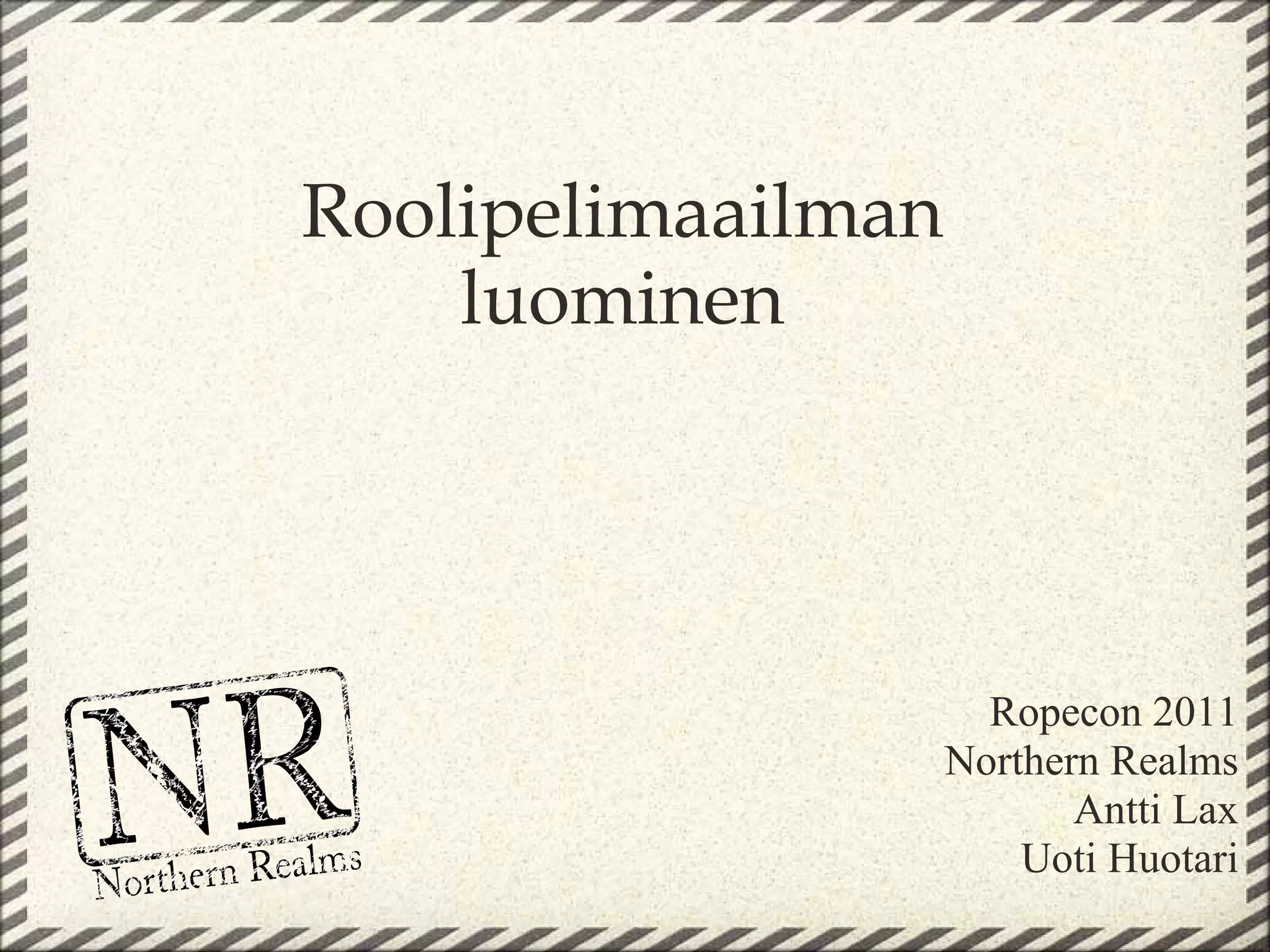 A presentation I had together with Uoti Huotari in the Ropecon 2011 convention. The presentation is in Finnish, and the topic is "Creating a RPG World". In the presentation we shared our experiences and knowledge that we gained from Bliaron and other RPG projects we have been working on. It was well received by the audience and we encouraged them to create a RPG world with us during the presentation.The result was very entertaining and both us and the audience and had fun.