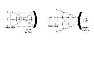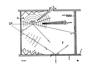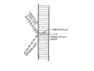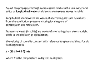 Sound can propagate as longitudinal waves through air and solids, and as transverse waves through solids. The velocity of sound in air depends on temperature. Common units used to measure sound include decibels (loudness), hertz (frequency), and sone and phon (perceived loudness). Sound reflects off hard surfaces similarly to light, while diffraction causes bending around obstacles. The amount of sound absorbed versus reflected by a material is quantified by its absorption coefficient. Reverberation is the prolongation of sound after the source stops due to reflections, and reverberation time is used to characterize how long reflections are audible in a space.