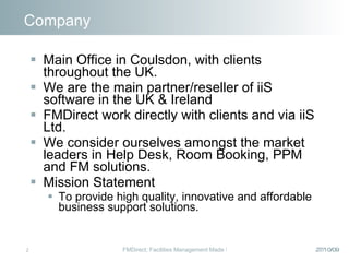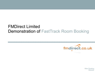 This document summarizes FMDirect Limited, a company that provides facility management solutions including room booking software. It discusses FMDirect's partnership with iiS software, an industry leader in help desk, room booking, and FM solutions. It also provides an overview of FastTrack, FMDirect's room booking software, highlighting its key features such as automatic email confirmations, audit trails, and utilization reporting. Client testimonials praise FastTrack and iiS solutions for improving services and operations.