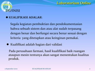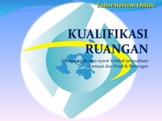 Dokumen ini menjelaskan pentingnya kualifikasi ruangan di laboratorium farmasi dan industri makanan untuk memastikan bahwa sistem dan alat berfungsi sesuai standar. Kualifikasi ini melibatkan pengendalian kondisi lingkungan seperti suhu, kelembaban, dan kontaminasi, serta mengikuti regulasi yang ketat terkait sistem tata udara. Selain itu, dokumen ini juga mencakup berbagai parameter dan kelas ruangan yang ditetapkan oleh berbagai standar, termasuk CPB, CGMP, dan ISO.