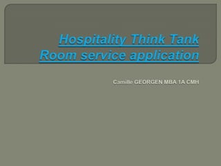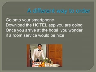 This document proposes a room service ordering app that allows hotel guests to order meals and items from their smartphones. The app would allow guests to browse menu options, customize their orders, and place everything they want without needing to call the hotel. It is suggested that the app would be convenient for both guests and hotels by streamlining the ordering process and eliminating language barriers for employees.