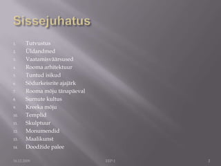 Rooma arhitektuurRoomlased oliäärmiselt geniaalsed ehitajad. Nad:1. võtsid kasutusele kaared ja võlvimise2. hakkasid tegema kupleid3. võtsid kasutusele mördi4. võtsid kasutusele aktiivselt veevärgi16.12.2009EEP-115