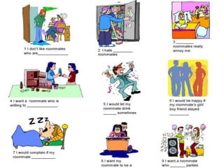 This document discusses living with a flatmate or roommate. It outlines some pros and cons such as shared responsibilities but lack of privacy. It also describes characteristics of the perfect flatmate such as being clean and respectful. Students then discuss and share descriptions of their ideal flatmate. They consider problems that may arise living with a flatmate and how to resolve them, such as personality clashes. Finally, it provides a hypothetical scenario where a room is available to rent and questions to ask a potential new flatmate.
