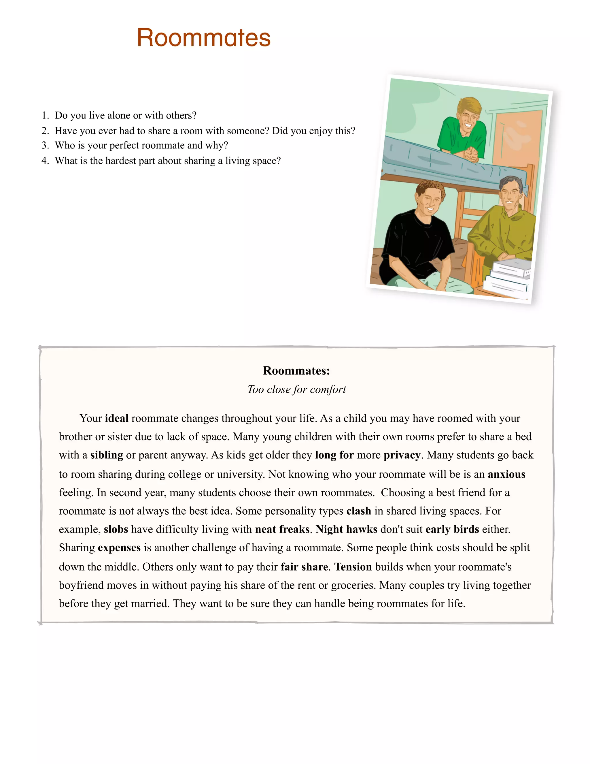 Having a roommate can be challenging as personalities and lifestyles may clash. Choosing a best friend as a roommate is not always the best idea as slobs and neat freaks or night owls and early birds can have difficulties living together. Sharing expenses also poses issues as roommates may disagree on how costs should be split, and tension arises when an additional person like a boyfriend moves in without contributing. Many couples try living together first to determine if they can handle being roommates for life.