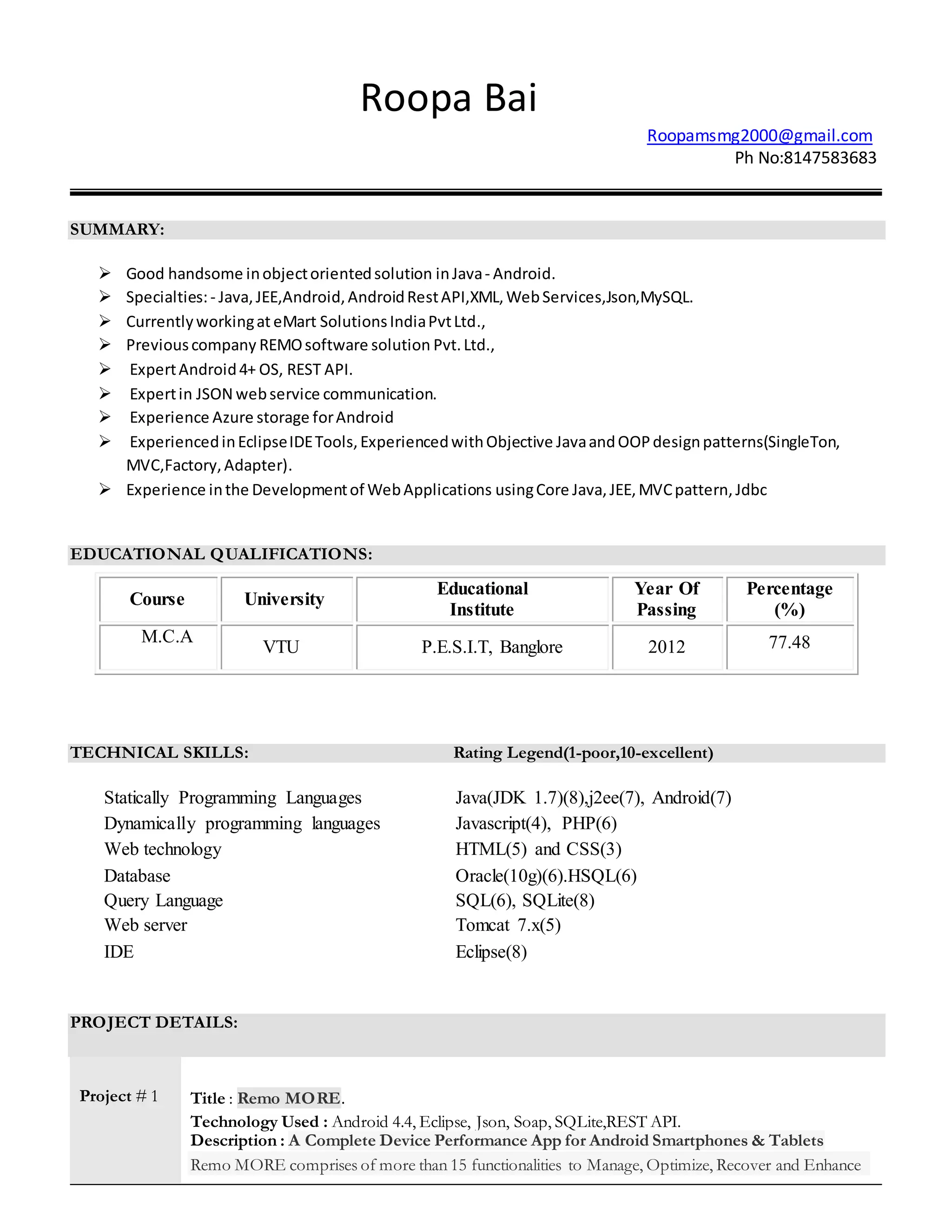 This document contains the resume of Roopa Bai which summarizes her skills and experience in Java, JEE, Android, web services, and databases. She has over 8 years of experience developing applications using technologies like Java, Android, PHP, MySQL, and frameworks like Spring and Hibernate. Currently she works as a Senior Android Developer at eMart Solutions and has experience building both mobile and web applications.
