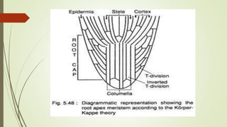 This document summarizes several theories of root apex organization and the concept of the quiescent centre. It discusses Nageli's apical cell theory, Hanstein's histogen theory, and Schuepp's Korper-Kappe theory, noting that each fails to fully explain root apex organization in angiosperms. The document also describes Clowes' discovery of the quiescent centre, a region of slow or non-dividing cells in the root apex meristem that is capable of resuming growth if surrounding tissue is damaged.